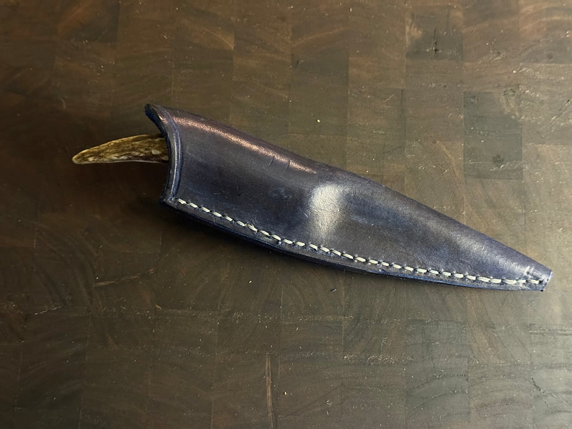 Low layer carbon steel Damascus (1084/15n20). Mokume gane guard (copper/nickel silver). Deer antler handle. 4” blade. 8.5” Overall length. Leather sheath included